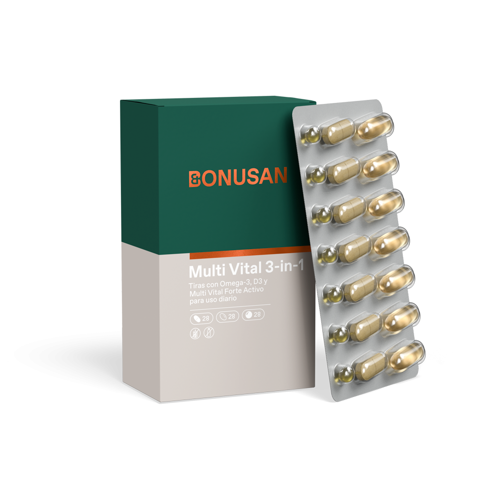 Multi Vital 3-in-1 contiene los tres suplementos básicos más importantes en un práctico envase mensual. Así, recibes a diario las vitaminas, los minerales y los ácidos grasos omega-3 necesarios en su forma de absorción más fácil.